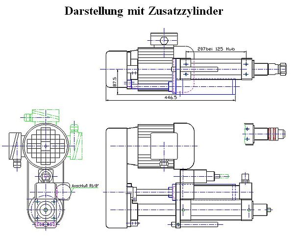 Für die Bohreinheit kann ohne großen Aufwand auch jederzeit ein Zusatzzylinder angebaut werden, z.B., wenn bei Mehrspindelbohrköpfen die Bohrkraft nicht ausreicht.