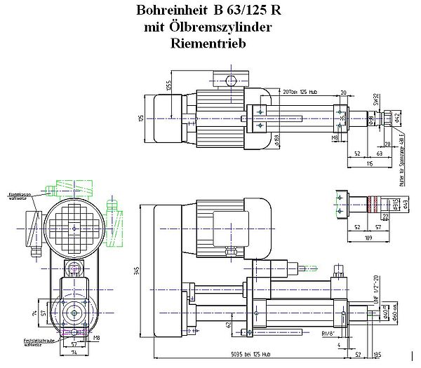 Eine weitere Besonderheit ist, dass der Ölbremszylinder den vollen Hub der Bohreinheit in Vorschub und Eilgang fahren kann. (Bei der Standardausführung mittels verstellbarem Anschlag, oder - gegen Aufpreis - als Eilgang- Vorschub- Sprungschaltung.)